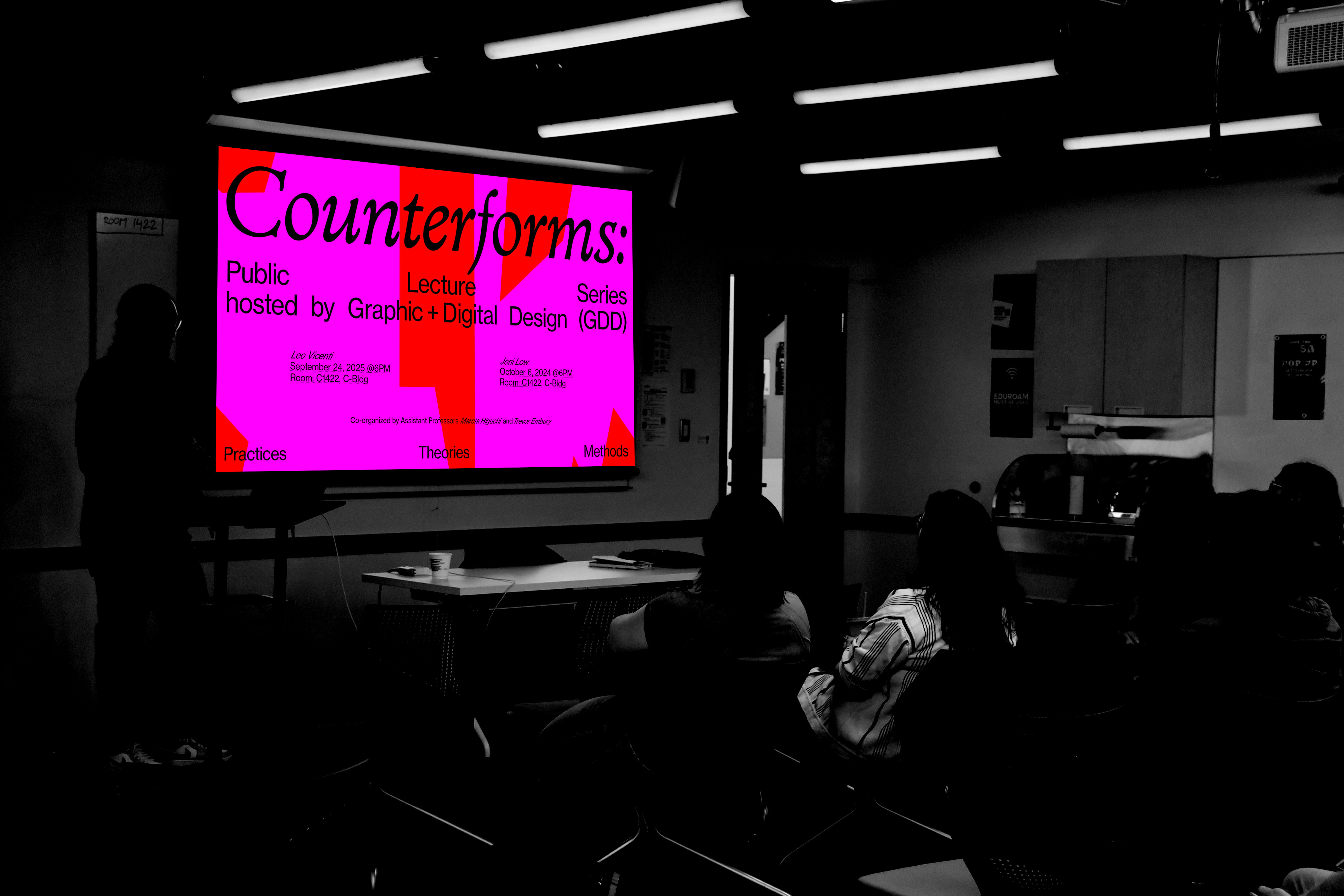︎︎︎Project: Counterforms: Practices, Theories, and Methods is a public lecture series hosted by the Graphic and Digital Design Department at the University of the Fraser Valley. Counterforms is a space to explore the complexities of design across its various modalities—from practice and activism to discipline and ways of knowing, and beyond. The 2025 series centers on the theme of disposition, inviting reflection on how attitudes, positions, and orientations shape design’s practices and potentials. Each lecture traced a unique pathway through design or art’s complex landscape, from Indigenous language revitalization through typography (Leo Vicenti) to relational infrastructures that sustain creative communities (Joni Low).